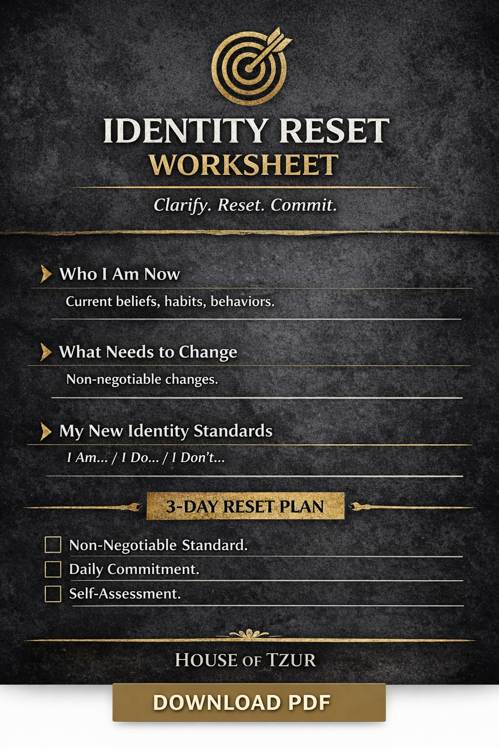 This worksheet guides you through identifying your present “I Am” statements, recognizing where you’ve lowered your standards, and defining the non-negotiable identity you’re building moving forward.