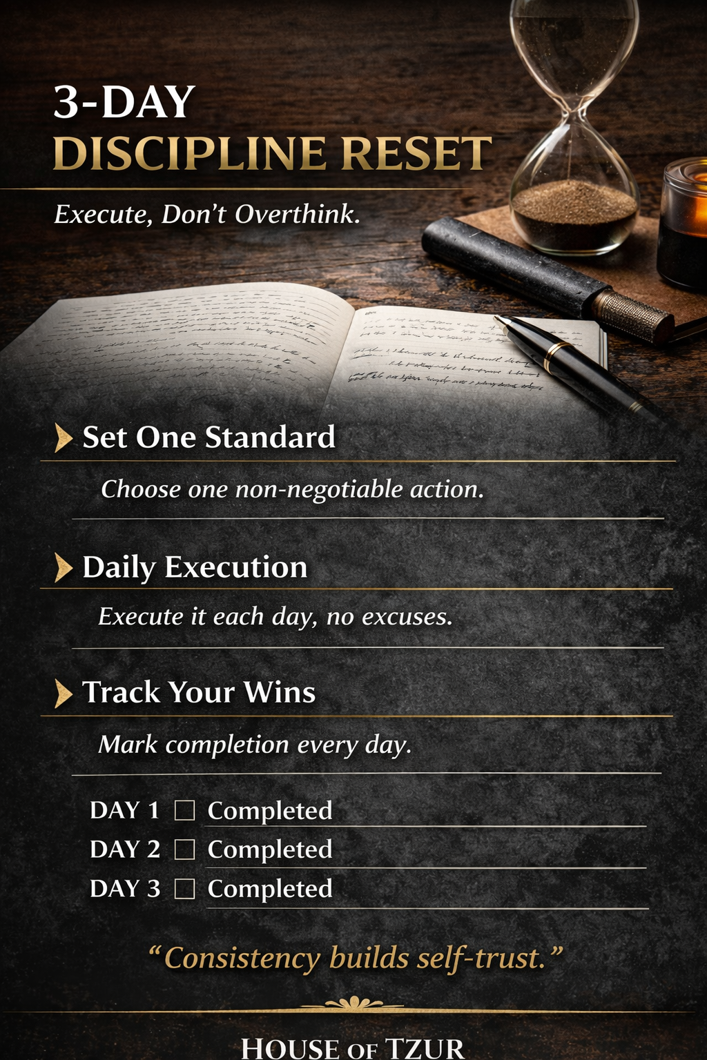 You’ll choose one non-negotiable standard and execute it consistently for three days, regardless of mood or circumstances. The goal is simple: reestablish control through action.